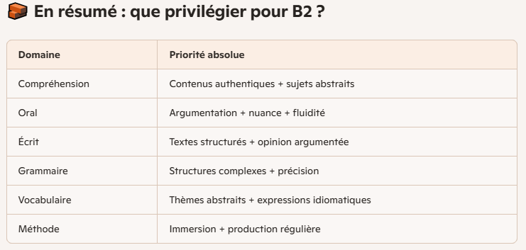 Voici ce qu’il faut privilégier pour atteindre le niveau B2, en m’appuyant sur les sources consultées Français avec Pierre cinga.fr blog.frenchwithmarionlim.com.