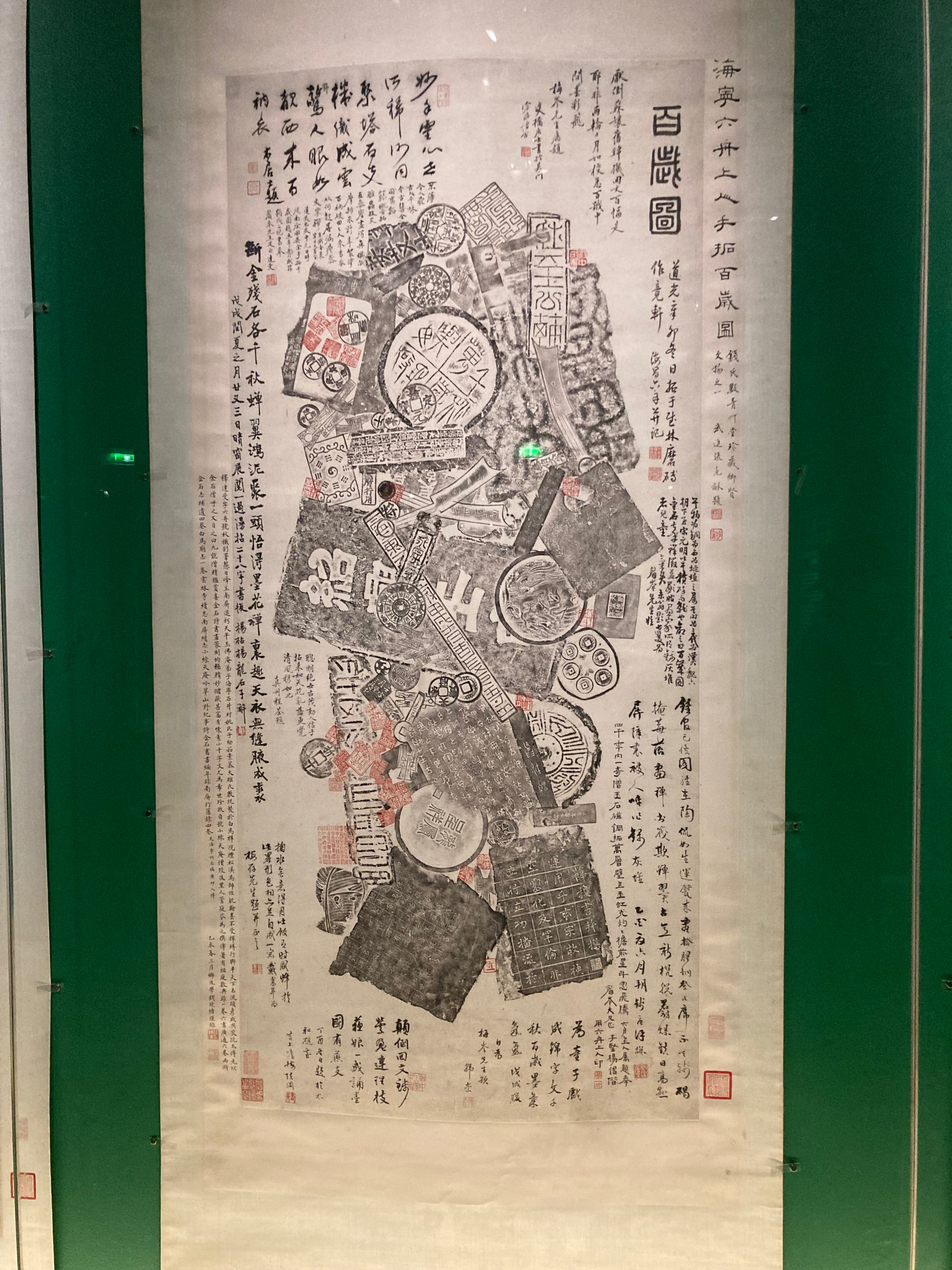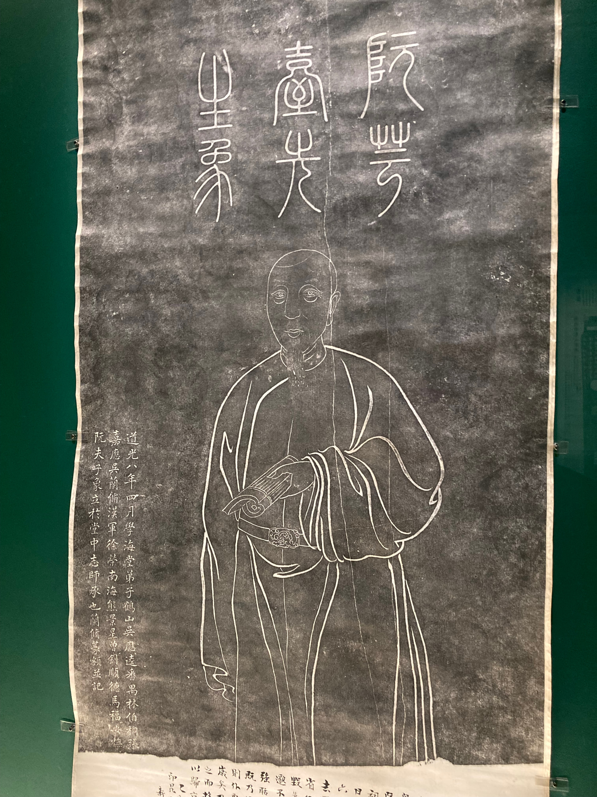 Estampage du portrait de Ruan Yuan daté de 1829, Encre sur papier, 125 * 61 cm, Hangzou, Musée de la province du Zhajiang - Ruan Yuan était un haut fonctionnaire, célèbre savant et collectionneur de bronze. Il est représenté ici un livre à la main. Ce portrait était gravé sur une stèle autrefois érigée dans l’académie Xuehai Tang, qu’il avait créée à Guangzhou (Canton),Lian Qichao (1873-1929), le grand intellectuel réformateur du début du XXème siècle et ancien élève de cette académie, lui rend un hommage dans le texte inscrit en bas de l’oeuvre.