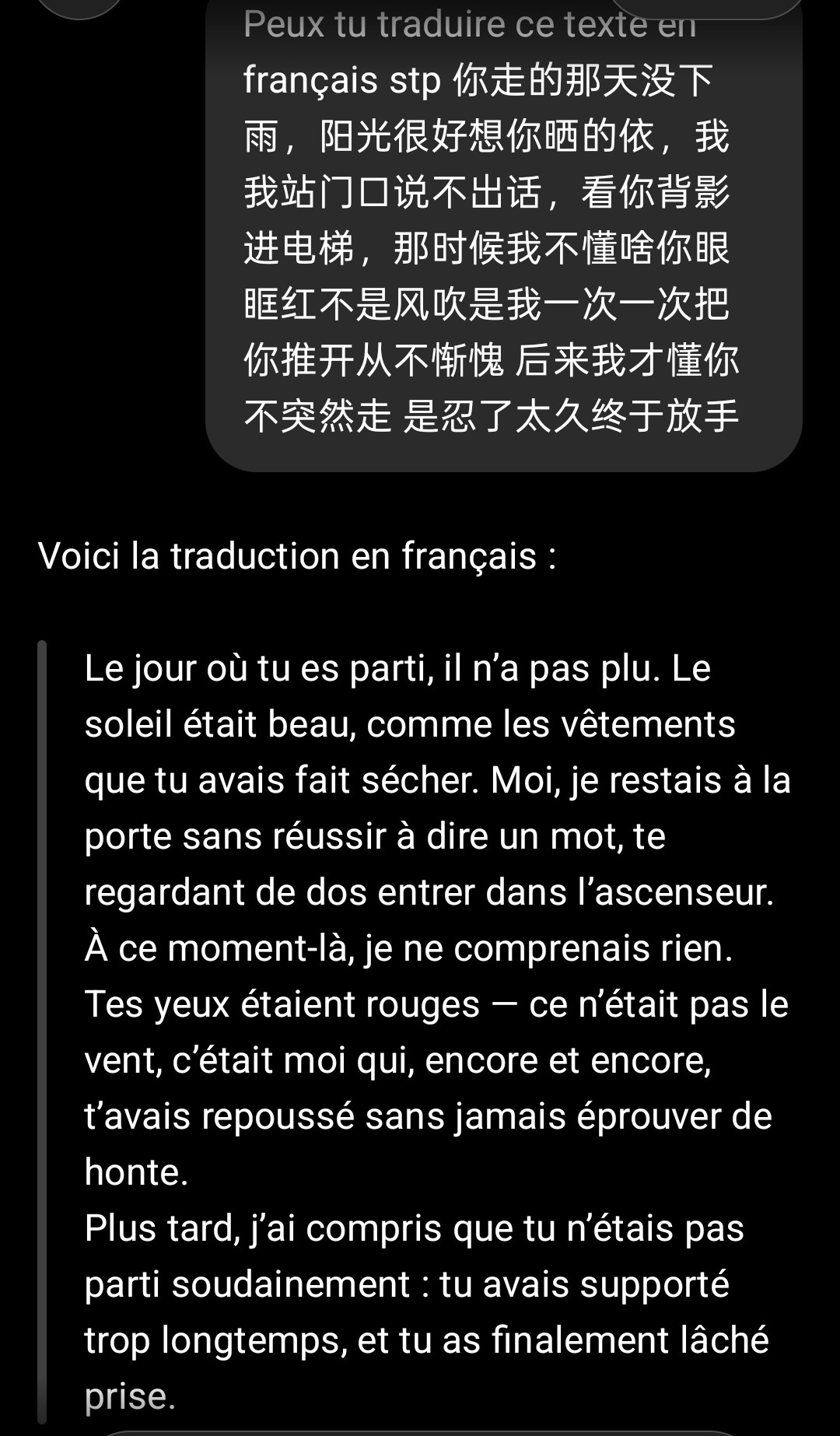 J’ai demandé la traduction à chat GPT du début de la chanson celle du mec avec la jolie voix