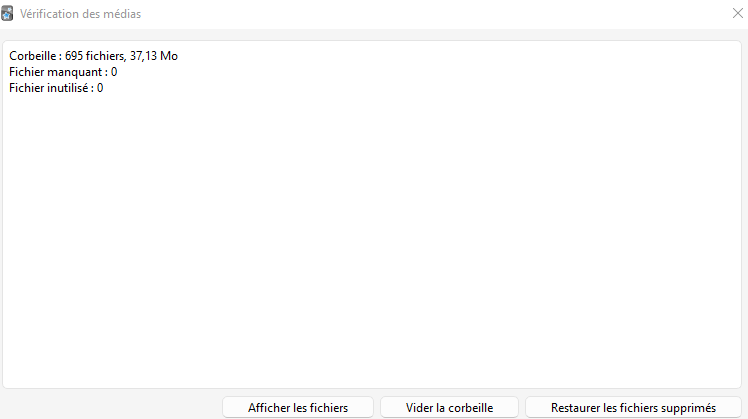 Si vous avez des fichiers inutilisés ou manquants, il vous le dit. Dans le cas de fichiers inutilisés –> les mettre dans la corbeille, pour les manquants –> cliquer sur le fichier présenté, la carte d’Anki devrait apparaitre avec le lien en question (Cela peut être une image mal copiée ou autre). -