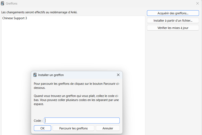 Mon problème est que le démarrage des greffons échoue et aussi que je ne peux plus rajouter automatiquement de nouvelles cartes en ne tapant que le hanzi ! si je rajoute les hanzi/ pinyin et audio manuellement ligne par ligne elles apparaissent sauf l’audio qui ne fonctionne pas.
