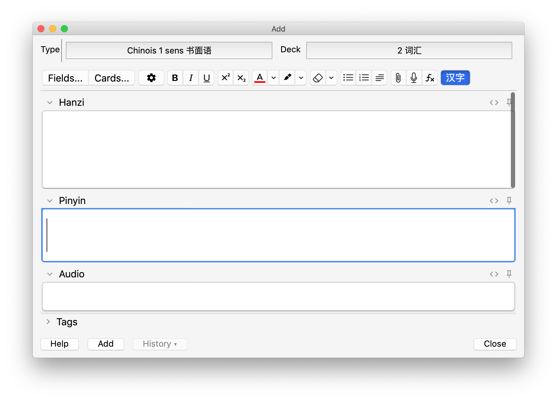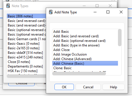 Je ne suis pas un expert, mais apparemment tu n’as pas besoin de faire « Add », puisque les types Chinese (basic) et Chinese (advanced) sont déjà présents dans tes types de notes (en regardant ta copie d’écran).