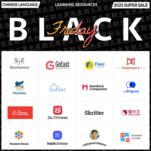 · Mandarin Companion - 30% off all Chinese learner merch @ (https://mandarincompanion.com/merch/) from November 15 to December 10 using code MCBF25.