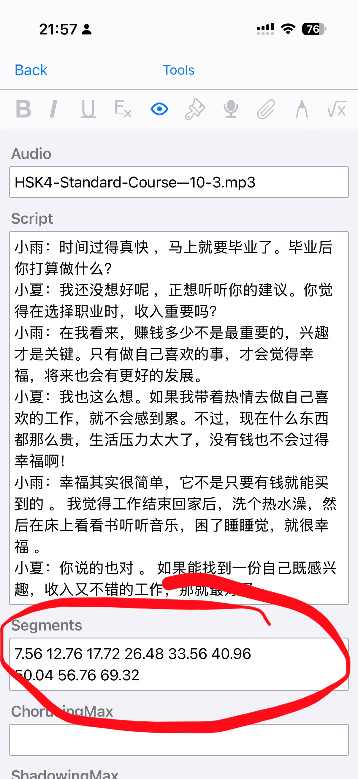 Ça permet notamment à l’interieur d’un long fichier de faire du chorusing / shadowing sur des sous segments joués en boucle à l’intérieur d’un long fichier. Chaque segment obtient un bouton numéroté donc on peut facilement passer de l’un à l’autre.