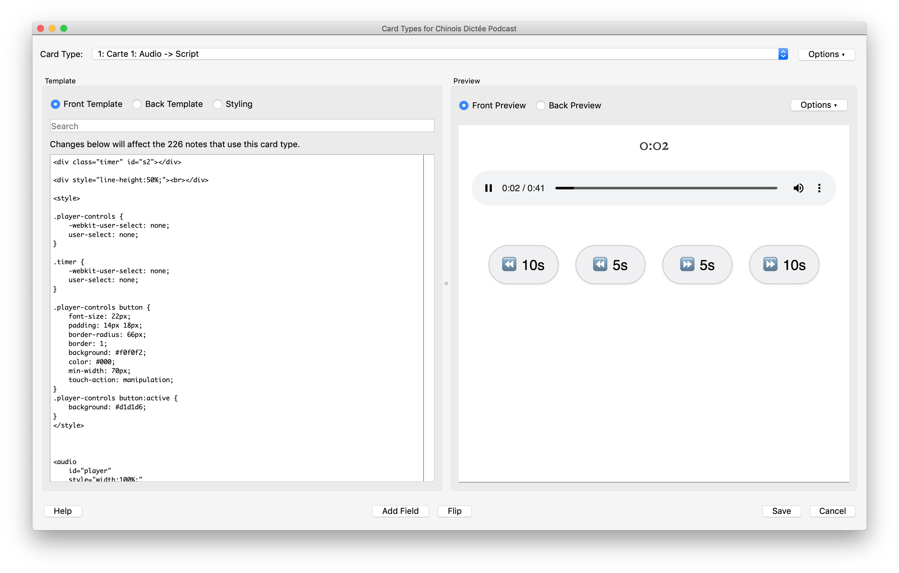 Ça fait quelques temps que je me suis remis à utiliser de manière intensive le deck « Podcasts » que j’avais créé en suivant la formation intermédiaire d’Alex. À l’époque mon but était juste de me rappeler fréquemment de retravailler un audio — notamment en faisant des dictées. Mais j’ai commencé à avoir la flemme au moment où les audios sont devenus de plus en plus longs. Et puis j’ai lâché l’affaire de l’écriture manuscrite il y a 2-3 ans, quand je suis arrivé en Chine.
