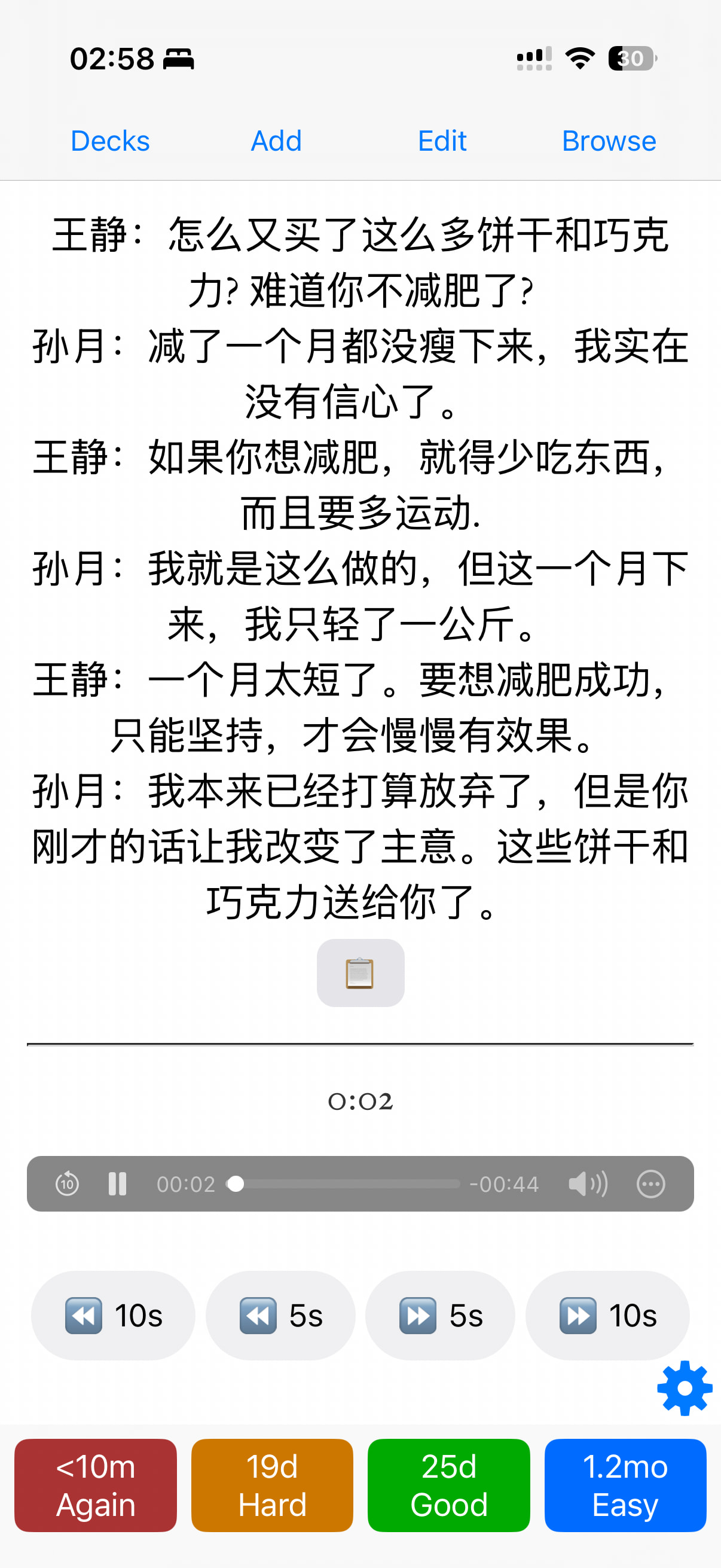 Je suis passé à autre chose en travaillant l’écoute et l’audio surtout via Glossika (dont je viens de me désabonner après 3 ans), méthode « listen and repeat » (presque « chorusing ») par phrases isolées que je continue de suivre gratuitement avec Anki + Chinese Spoonfed ou des phrases que j’isole moi-même d’autres supports comme des séries ou films.