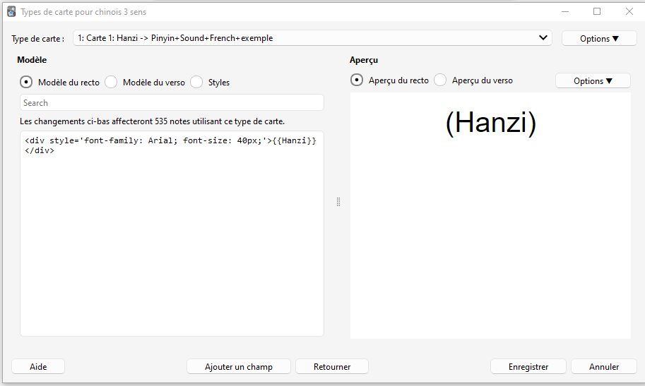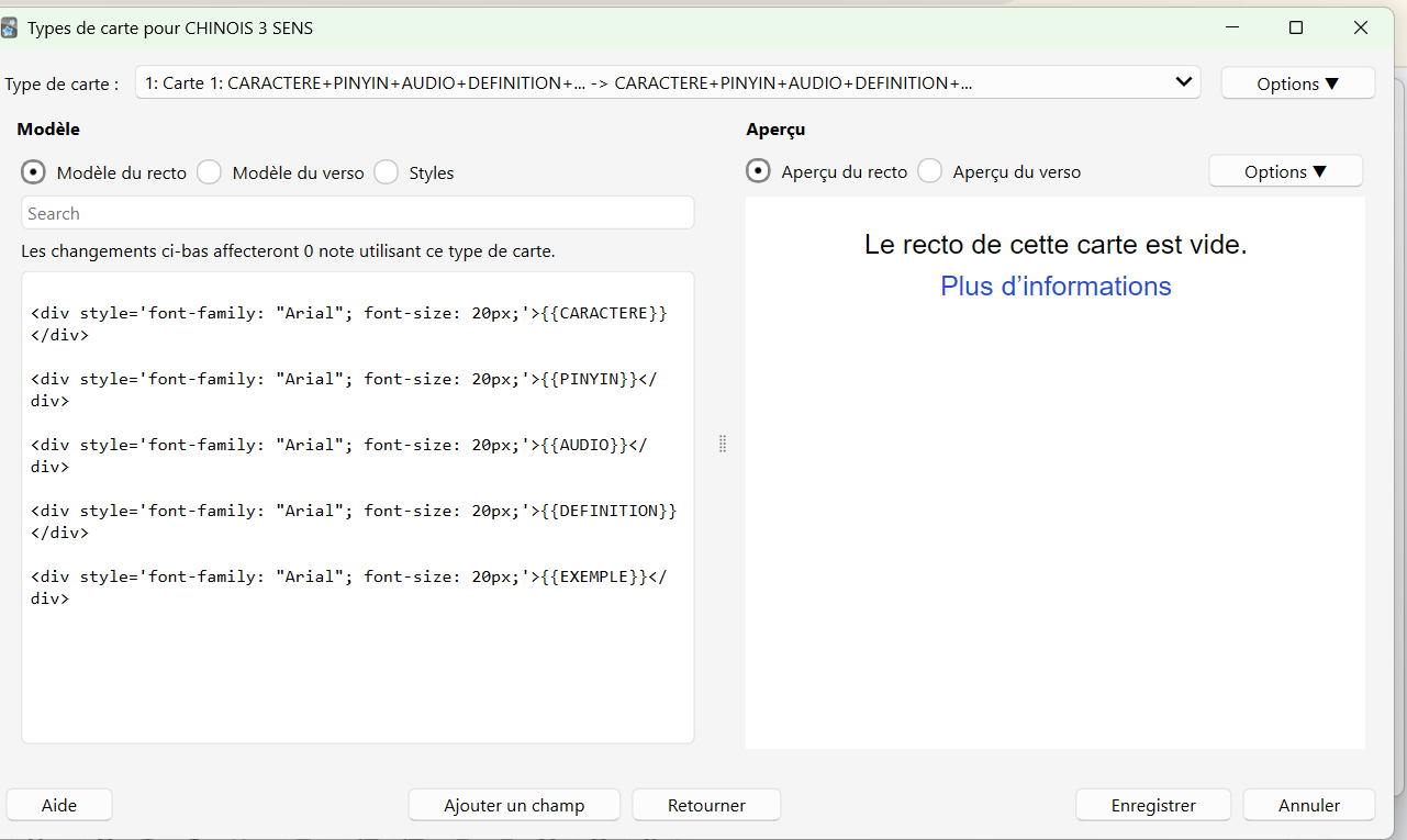 J’ai essayé d’installer ANKI à partir de la video d’alex . Dès la 9è mn je me noie . Après avoir installé les 5 champs créés pour le recto , la fenêtre est différente de celle qui apparaît dans ta vidéo , notamment l’aperçu reste désespérément vide. (voir copie d’écran) Si je fais enregistrer je reviens à l’écran précédent, si je vais sur verso ce que je pourrais ajouter n’apparait pas non plus à droite, l’aperçu reste vide.